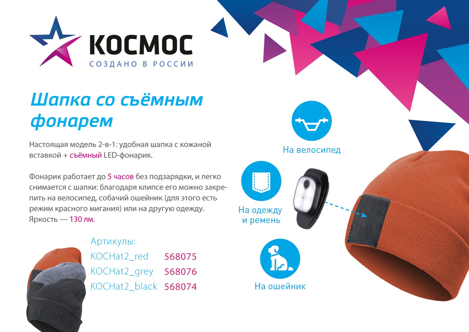 яяяШапка с фонариком черная (фонарь снимается 3,7В/300мА.ч 3реж) Космос 215*205*5 KOCHat2 black*1/50