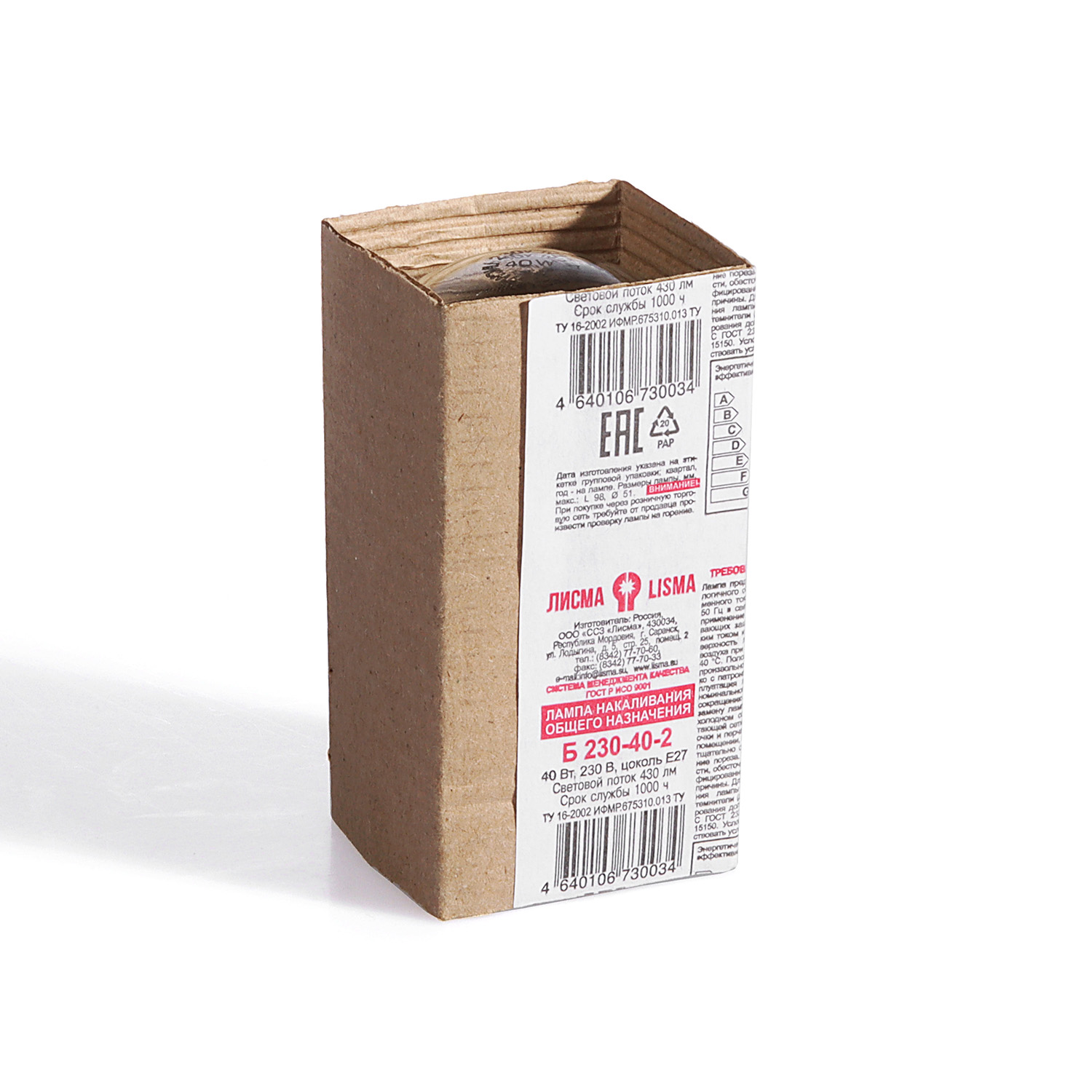 Лампа накаливания Лисма, Е27, груша, 40 Вт, 430 Лм, теплый белый свет