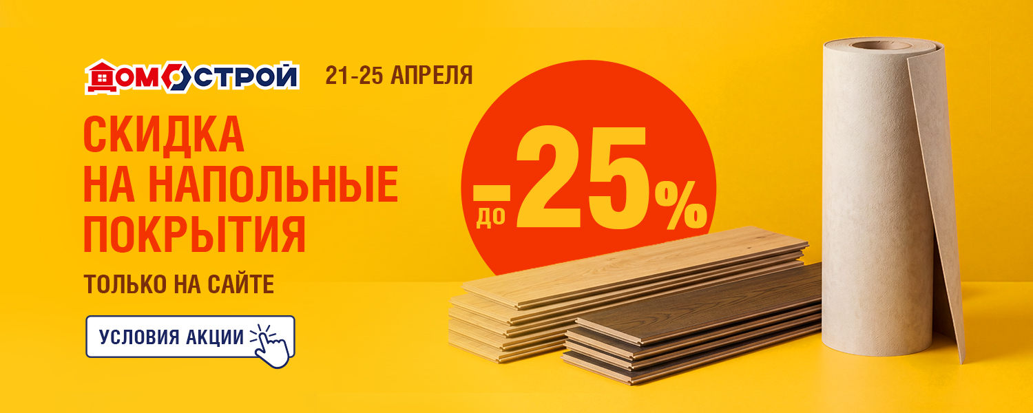 Онлайн-распродажа в сети ДомоСтрой: с 21 по 25 апреля — скидка до -25% на напольные покрытия. Пол задаёт тон всему дому. От него зависит и уют, и общее ощущение пространства: тёплый ламинат, практичный линолеум или износостойкое покрытие. Если давно хотелось обновить покрытие — сейчас самое время.